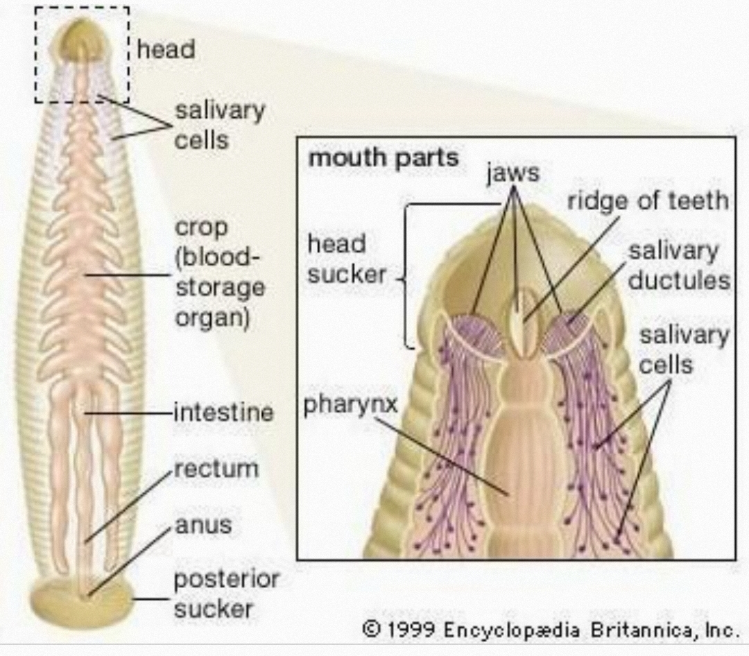 2)Leeches have suckers on both ends of their body for sucking blood. Most species have three jaws equipped with small, sharp teeth. Their teeth are even able to pierce thick skin of a hippopotamus.